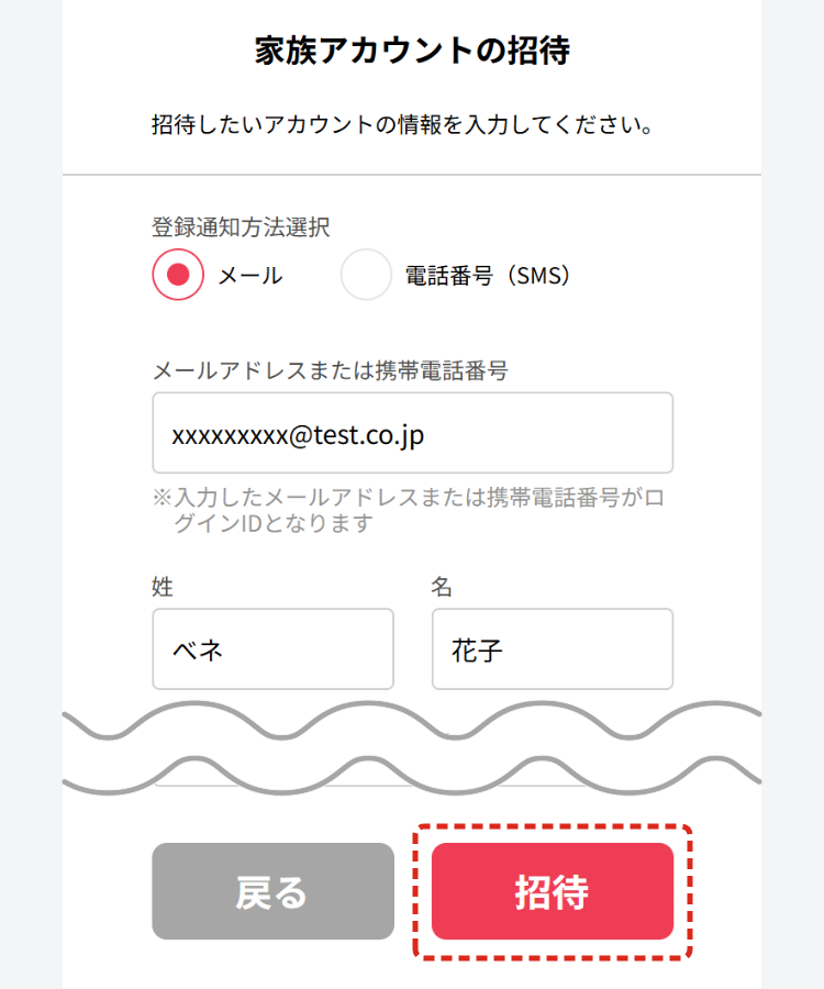 入力したメールアドレス、または携帯電話番号が、ご家族のベネアカウントとして設定されます。