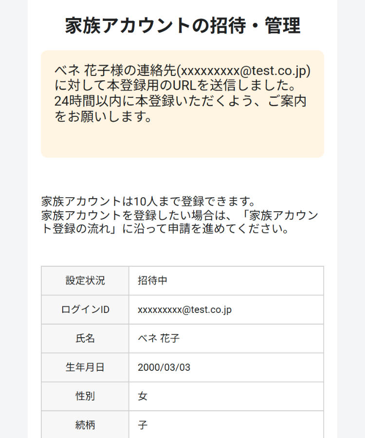 - ご家族アカウントの本登録が完了しました。