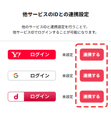 他サービスIDを連携いただくとログインが便利になります。以下のように連携設定を行ってください。
