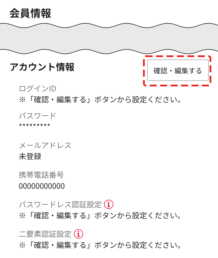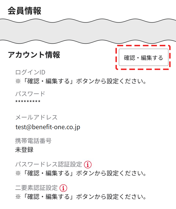 - ベネアカウントでログイン後、マイページ内の会員情報設定画面から「アカウント情報 」の「確認・編集する」を押下してください。
