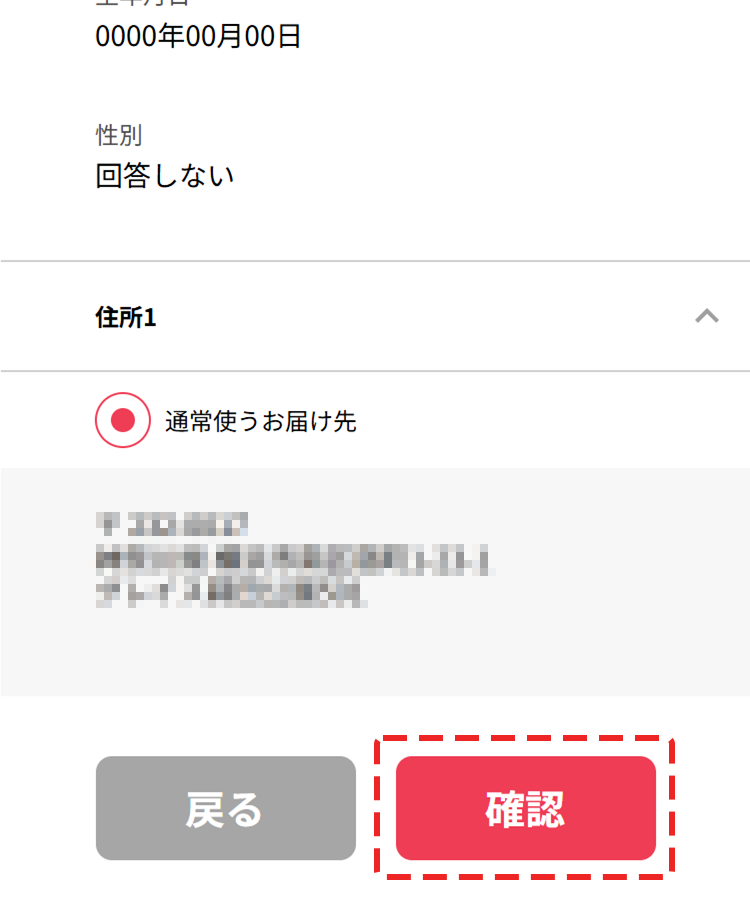 - 設定した住所にお間違いがないか確認いただき、「確認」を押下してください。